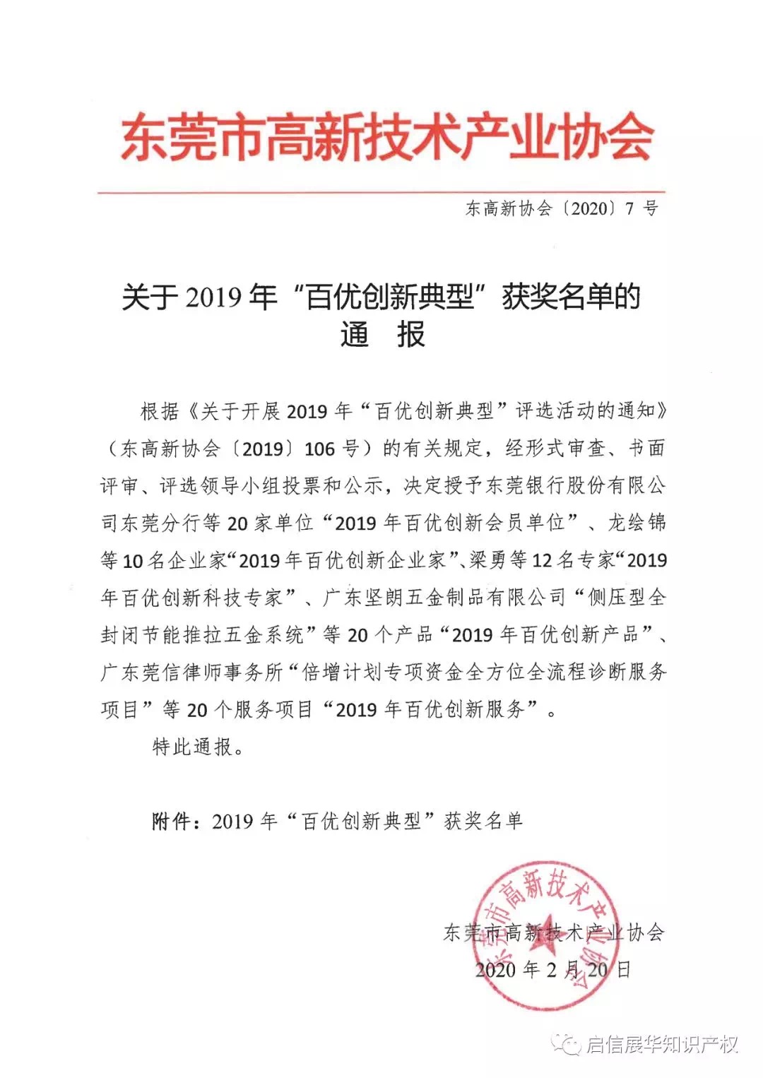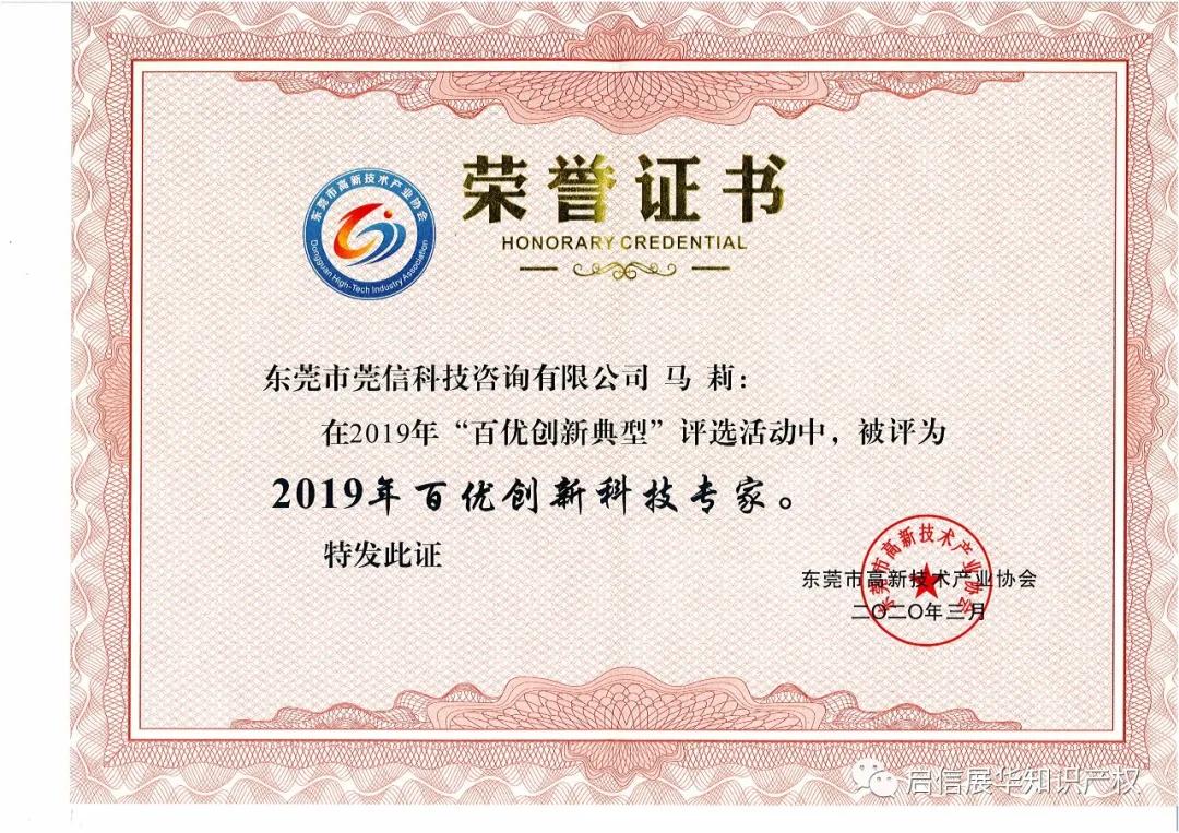 在东莞市高新技术产业协会开展的2019年“百优创新典型”评选活动中,我司的马莉同志被授予“2019年百优创新科技专家“的荣誉称号!