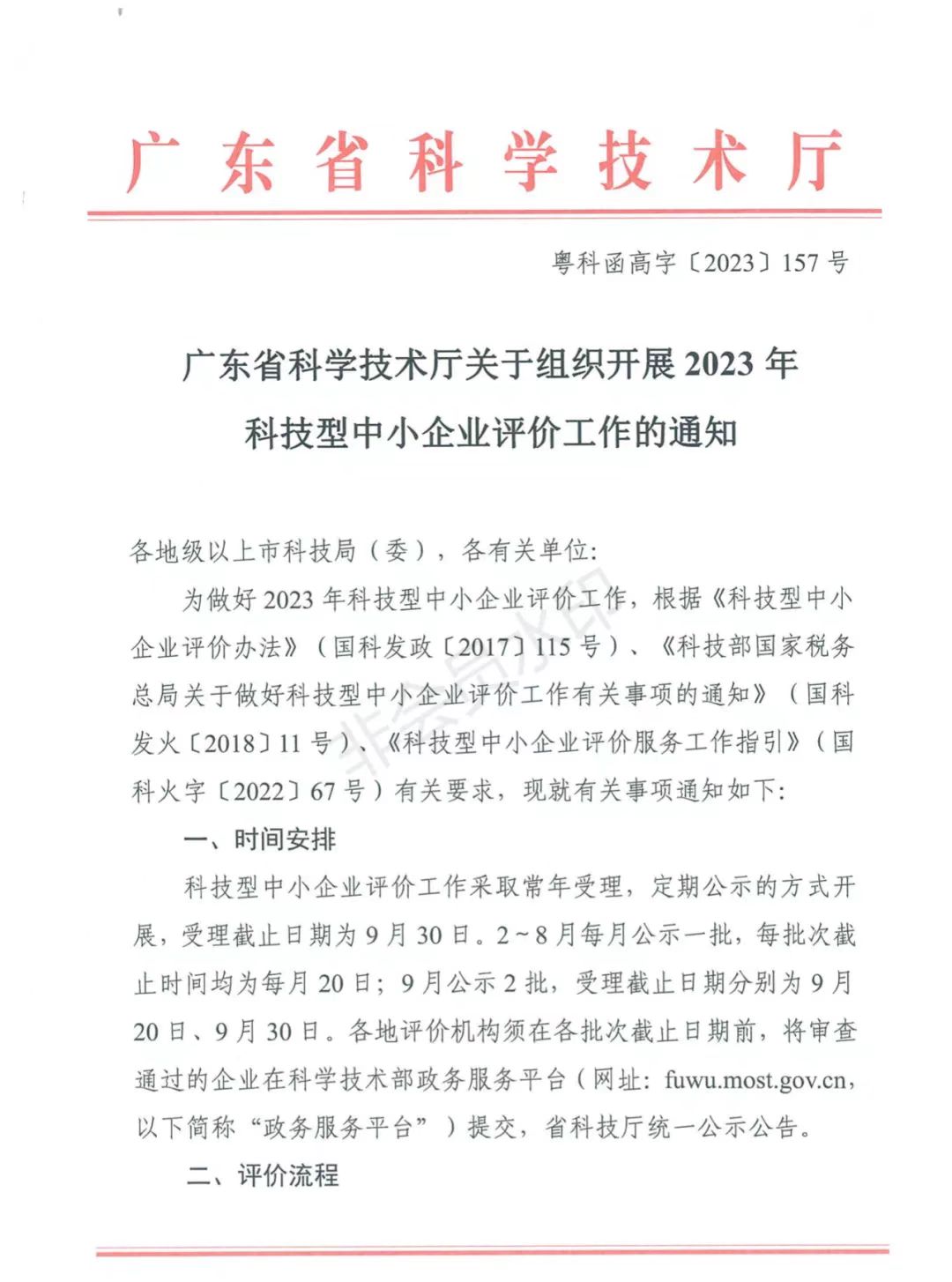 【时间安排】科技型中小企业评价工作采取常年受理,定期公示的方式开展,受理截止日期为9月30日。2~8月每月公示一批,每批次截止时间均为每月20日;9月公示2批,受理截止日期分别为9月20日、9月30日。各地评价机构须在各批次截止日期前,将审查通过的企业在科学技术部政务服务平台(网址:fuwu.most.gov.cn,以下简称 “政务服务平台”)提交,省科技厅统一公示公告。
