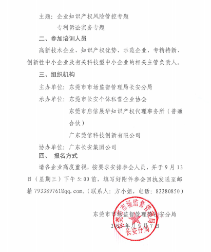 为提升企业知识产权管理人员业务能力,掌握工作技巧,能结合企业实际情况开展管理提升实践,并通过知识产权运用、保护和转化,实现企业高质量发展。我局决定开展知识产权入园惠企培训活动,邀请专家授课,分享先进工作经验和实操工作方法,现将培训活动有关事项通知如下: