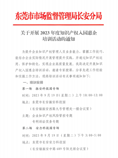 为提升企业知识产权管理人员业务能力,掌握工作技巧,能结合企业实际情况开展管理提升实践,并通过知识产权运用、保护和转化,实现企业高质量发展。我局决定开展知识产权入园惠企培训活动,邀请专家授课,分享先进工作经验和实操工作方法,现将培训活动有关事项通知如下: